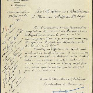 Le décret du 11 mars 1922, paru au Journal Officiel du 14 mars, installe Abel Maisonobe, administrateur du Territoire de Belfort depuis 1920, à la fonction de préfet. C’est avec cette nomination qu’est officiellement né ce nouveau département.