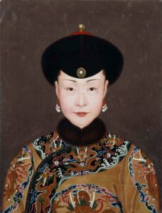Le portrait en buste d’une concubine impériale fait partie d’une série de 200 portraits réalisés par Jean-Denis Attiret, comprenant des effigies de concubines impériales et de dignitaires mongols. Cette œuvre, entrée au musée en 2001, est une huile sur papier représentant Ulanara, future impératrice après le décès de la première femme de l’Empereur Qianlong. La jeune femme est coiffée d’une toque en fourrure de loutre, ornée d’une perle en son sommet, avec un bijou frontal, et porte des boucles d’oreilles traditionnelles en perles de Mandchourie. Elle est vêtue d’une « robe au Dragon », symbole de la puissance impériale. Les robes jaunes en soie, décorées d’un dragon à cinq griffes et à tête cornue, sont réservées à l’empereur, à l’impératrice et aux principales concubines. Ces vêtements ne sont pas seulement des symboles de statut ; ils sont aussi censés apporter la chance au peuple. La richesse des vêtements et des accessoires témoigne de la parfaite maîtrise de Jean-Denis Attiret de la symbolique du costume chinois. Ce portrait est typique des œuvres réalisées à la cour de l’Empereur Qianlong, un style partagé par Attiret et Giovanni Castiglione, ce qui rend parfois l’attribution de cette œuvre complexe.