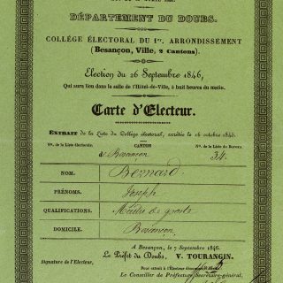 Objet symbole du droit de vote, la carte d’électeur est également liée au processus de création des papiers d’identité. Elle n’a été rendue obligatoire qu’en 1884 mais, dès les premières élections révolutionnaires, beaucoup de communes l’instaurent pour identifier les votants.