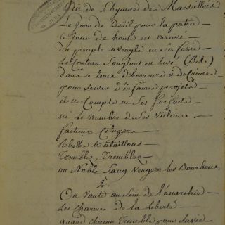 Cette chanson sur « l’air des Marseillais » figure au sein d’un recueil d’autres textes et chansons d’inspiration royaliste ou contre-révolutionnaire extrait des minutes du tribunal de district d’Arbois.