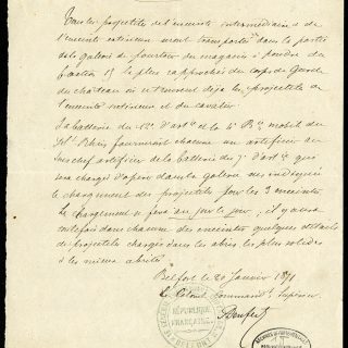 Cet ordre, de la main de Denfert-Rochereau, gouverneur de la place de Belfort, est daté du 20 janvier 1871. Il ordonne le transport des projectiles stockés dans les enceintes extérieures et intermédiaires dans un magasin à proximité du château, à l’abri des tirs ennemis.