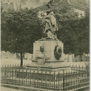 Cette carte postale de la fin du XIXème siècle représente le monument « Quand-Même » sculpté par Antonin Mercié sur décision de la municipalité de Belfort en 1884, afin de rendre hommage à Adolphe Thiers et Denfert-Rochereau.