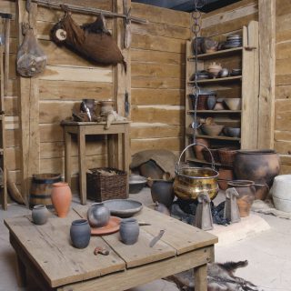 Cet intérieur reconstitué est exposé au musée. Le cadre de vie d’une famille modeste de Bibracte est ici évoqué à un moment où l’impact de la romanisation ne se fait pas encore sentir.