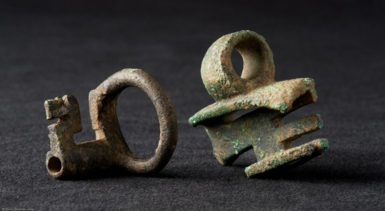 Clefs de coffret portées en bague (à gauche) et en pendentif (à droite), alliage cuivreux, Ier-IIe s. de notre ère, Labergement-Foigney (Côte-d’Or), 2012. © Denis Gliksman, Inrap